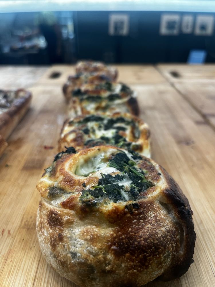 Fresh mozzarella, spinach, onions, feta, pine nuts, and herbs.
